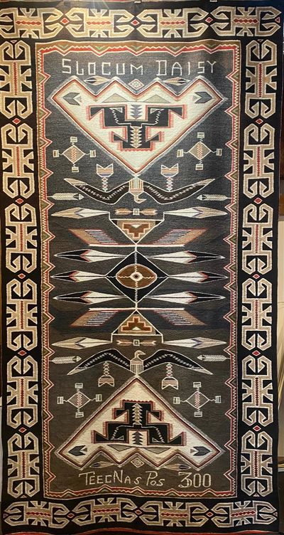 If you are looking for a True One-of-a-Kind Weaving then this is it. Daisy Slocum incorporated her name into this Weaving. Besides her Name, it Features two Eagles, Feathers, the Teec Nos Pos (she spelled Teec Nas Pos) Area and the unique number 300 into it. The Center of this Weaving Draws you in like a Black Hole.